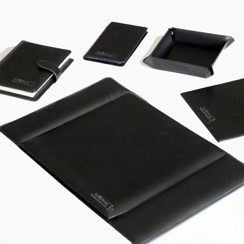 Ce kit sous-main élégant et design avec le logo incorporé en noir, constitué de sous-main, bloc-notes, porte carte visite, portefeuille et porte stylo deviendra indispensable à votre bureau