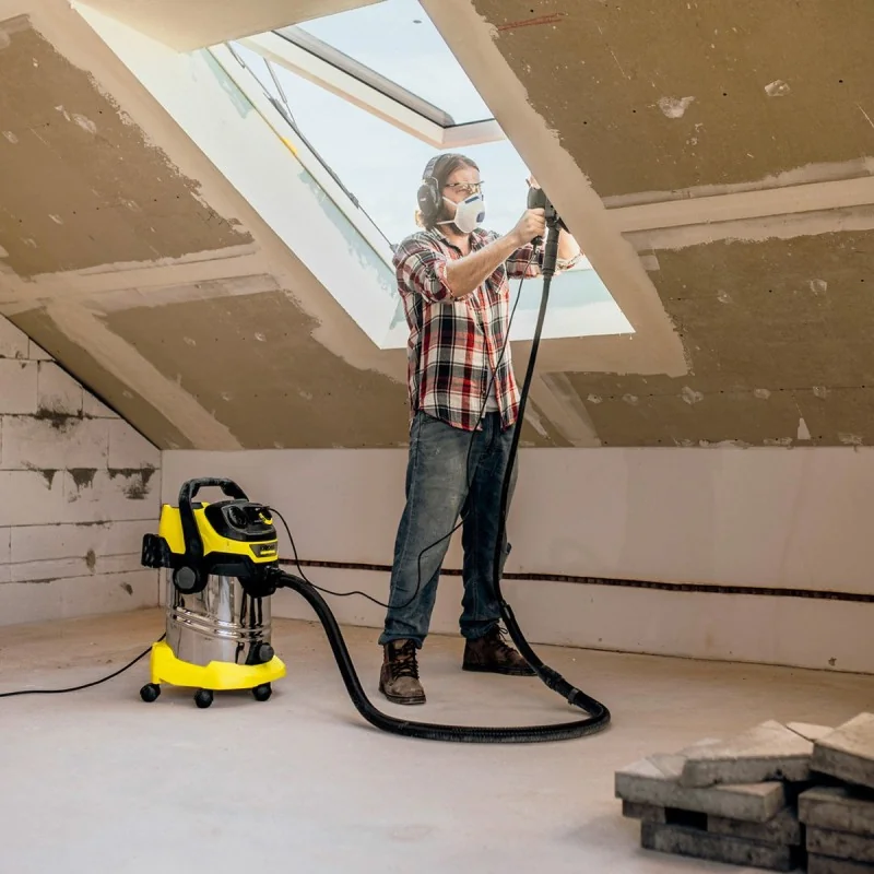 Aspiration ultra-puissante et efficacité énergétique exceptionnelle, avec une consommation de seulement 1300 watts : L'aspirateur eau et poussière WD 6 P S V-30/6/22/T est équipé d'un réservoir en acier inoxydable de 30 litres, d'un câble de 6 mètres et d'un tuyau d'aspiration de 2,2 mètres de long. La vis de vidange permet de vider facilement les liquides aspirés. Des outils électriques tels que des scies ou des ponceuses peuvent être connectés via la prise intégrée avec interrupteur marche/arrêt automatique. Les saletés sont immédiatement aspirées. Le bouton rotatif permet à l'utilisateur d'ajuster la puissance d'aspiration selon ses besoins. Le filtre plissé plat peut être retiré en ouvrant la boîte à filtre, sans entrer en contact avec la saleté.