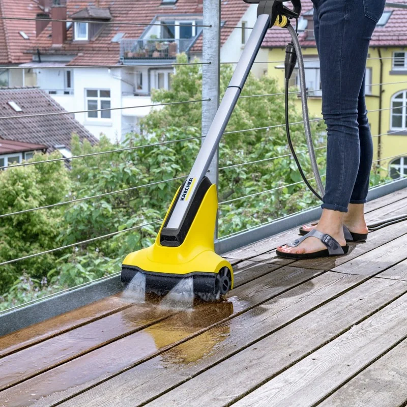 Le nettoyeur de terrasses PCL4 enlève soigneusement et uniformément les saletés grâce à ces deux brosses-rouleaux combiné à l'action de l'eau en le raccordant à un tuyau d'arrosage.