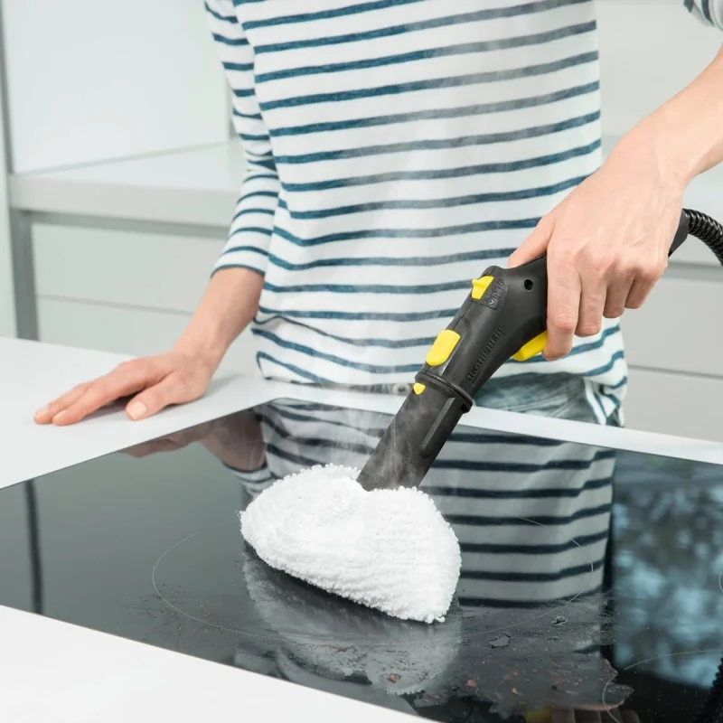 le nettoyeur vapeur SC 4 EasyFix se démarque par son rangement pour cordon, son compartiment pour accessoires et la position de stationnement pour le suceur pour sol. Doté d'une articulation flexible, le suceur pour sol EasyFix garantit une ergonomie optimale et, grâce à sa technologie de lames de racleur, des résultats irréprochables. Le système de bandes autoagrippantes pratique permet la fixation simple et rapide de la lingette de sol en microfibres au suceur pour sol et un retrait sans contact avec la saleté. La régulation de la vapeur à 2 positions permet d'ajuster l'intensité de la vapeur en fonction de la surface et du degré d'encrassement. La vaste gamme d'accessoires permet de redonner tout leur éclat au carrelage, aux plaques de cuisson et à la hotte jusque dans les moindres interstices, même en cas de saleté incrustée.