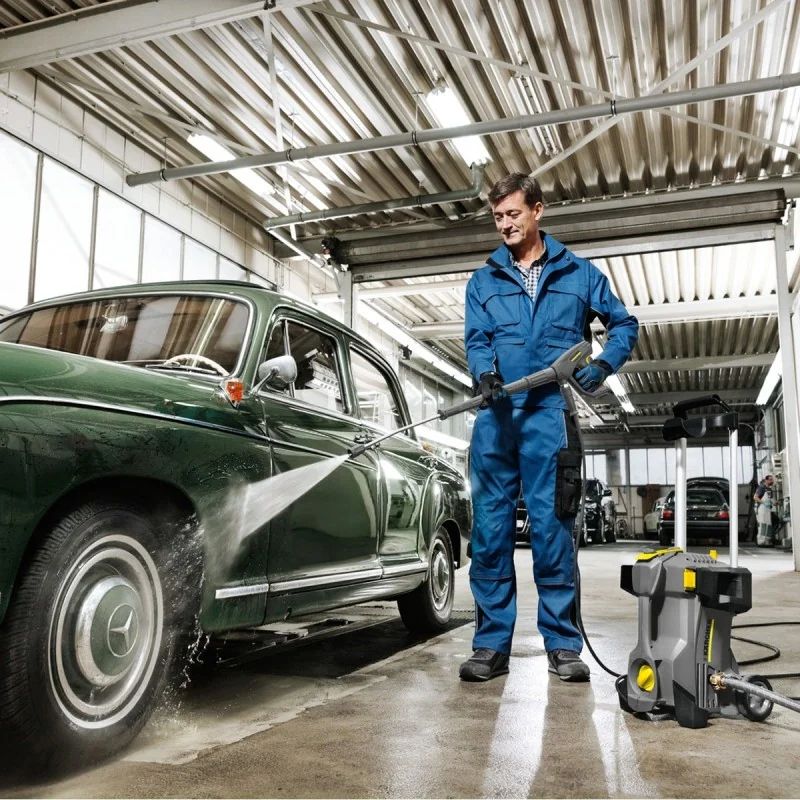 Le nettoyeur haute pression compact HD 4/10 X Plus Classic est équipé d'une rotabuse et d'un enrouleur de flexible. Il est facile à manœuvrer grâce à une poignée de transport télescopique et des roues robustes, assurant une grande ergonomie et une mobilité optimale.
