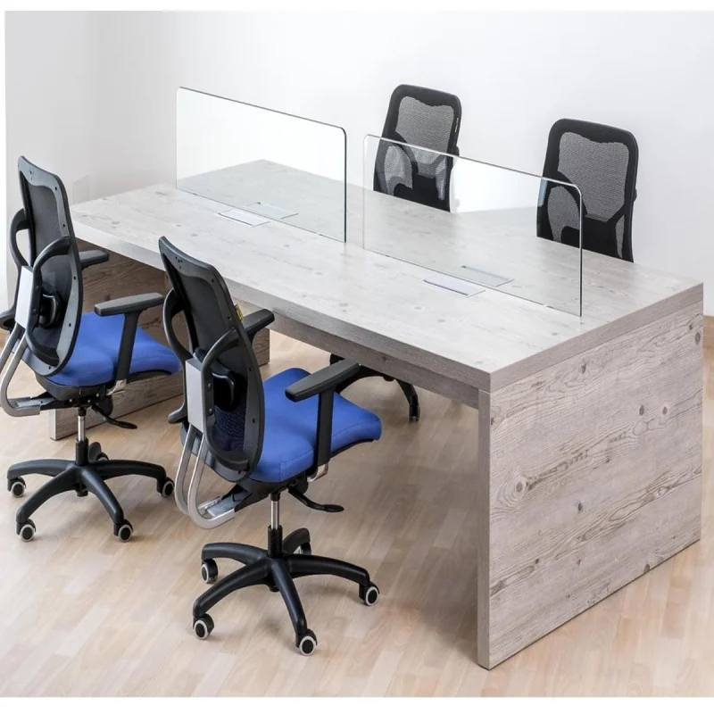 Plateau de travaille en panneau stratifié plaqué épaisseur 49mm bordure droit avec couvre chant sur le pourtour de 4/10 de mm antichoc. Piètements en panneau stratifié plaqué épaisseur 49 mm bordure droit avec couvre chant sur le pourtour de 0.4 mm antichoc. Cache jambe en panneau stratifié plaqué épaisseur 18 mm bordure droit avec couvre chant sur le pourtour de 0.4 mm antichoc. Séparations en dalle de verre claire fixé au plateau avec des équerres métallique.