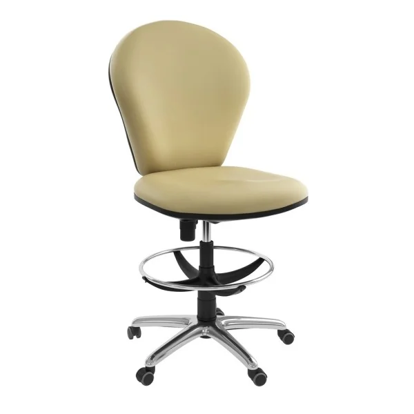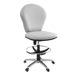 Assise et dossier en mousse injectée. Revêtement en simili cuir. Mécanisme Basculant, tournant, roulant, réglable en hauteur. Structure étoilé à 05 branches en couleur chromé avec 05 roulettes tournantes roulantes à double galets même matière avec repose pieds métal chromé.