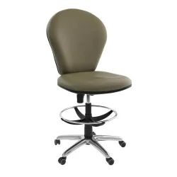 Assise et dossier en mousse injectée. Revêtement en simili cuir. Mécanisme Basculant, tournant, roulant, réglable en hauteur. Structure étoilé à 05 branches en couleur chromé avec 05 roulettes tournantes roulantes à double galets même matière avec repose pieds métal chromé.