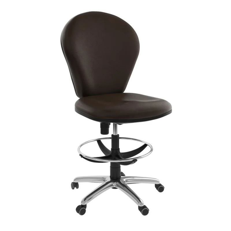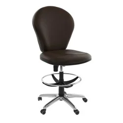 Assise et dossier en mousse injectée. Revêtement en simili cuir. Mécanisme Basculant, tournant, roulant, réglable en hauteur. Structure étoilé à 05 branches en couleur chromé avec 05 roulettes tournantes roulantes à double galets même matière avec repose pieds métal chromé.