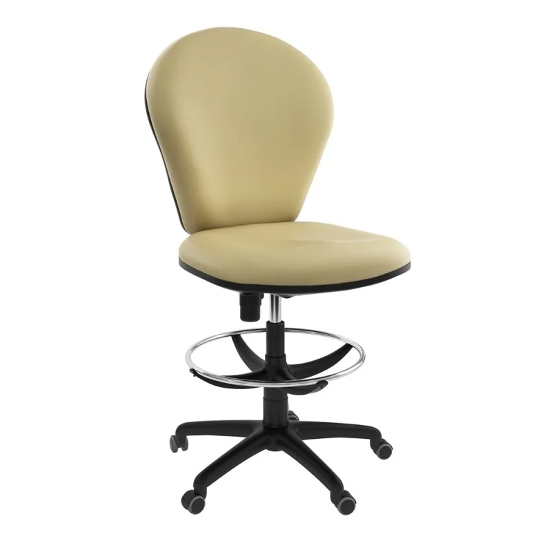 Assise et dossier en mousse injectée. Revêtement en simili cuir. Mécanisme Basculant, tournant, roulant, réglable en hauteur. Structure étoilé à 05 branches en couleur noir avec 05 roulettes tournantes roulantes à double galets même matière avec repose pieds métal chromé.