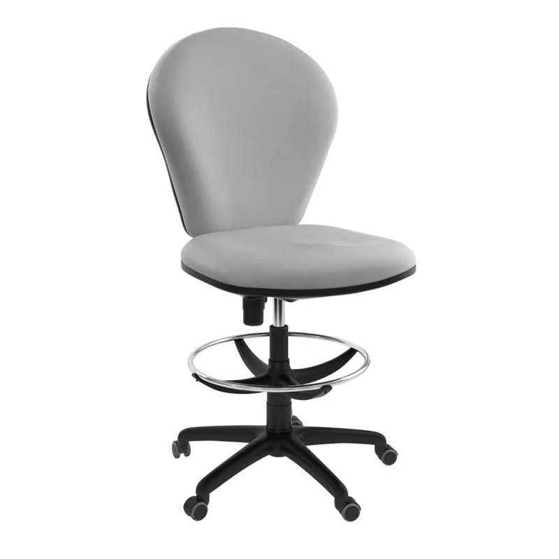 Assise et dossier en mousse injectée. Revêtement en simili cuir. Mécanisme Basculant, tournant, roulant, réglable en hauteur. Structure étoilé à 05 branches en couleur noir avec 05 roulettes tournantes roulantes à double galets même matière avec repose pieds métal chromé.