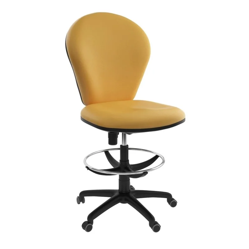 Assise et dossier en mousse injectée. Revêtement en simili cuir. Mécanisme Basculant, tournant, roulant, réglable en hauteur. Structure étoilé à 05 branches en couleur noir avec 05 roulettes tournantes roulantes à double galets même matière avec repose pieds métal chromé.