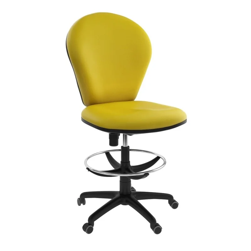 Assise et dossier en mousse injectée. Revêtement en simili cuir. Mécanisme Basculant, tournant, roulant, réglable en hauteur. Structure étoilé à 05 branches en couleur noir avec 05 roulettes tournantes roulantes à double galets même matière avec repose pieds métal chromé.