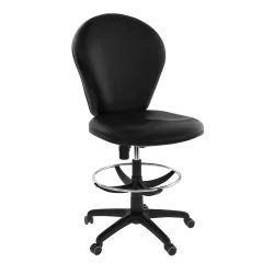 Assise et dossier en mousse injectée. Revêtement en simili cuir. Mécanisme Basculant, tournant, roulant, réglable en hauteur. Structure étoilé à 05 branches en couleur noir avec 05 roulettes tournantes roulantes à double galets même matière avec repose pieds métal chromé.