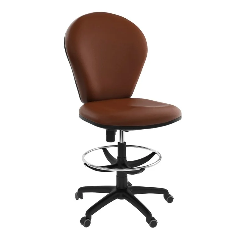 Assise et dossier en mousse injectée. Revêtement en simili cuir. Mécanisme Basculant, tournant, roulant, réglable en hauteur. Structure étoilé à 05 branches en couleur noir avec 05 roulettes tournantes roulantes à double galets même matière avec repose pieds métal chromé.