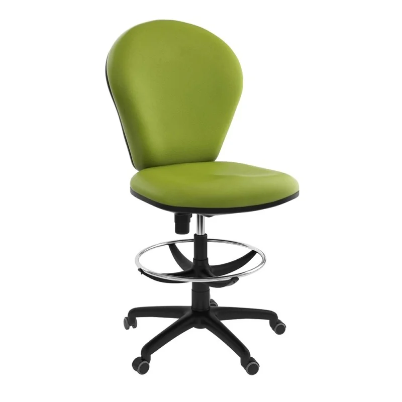 Assise et dossier en mousse injectée. Revêtement en simili cuir. Mécanisme Basculant, tournant, roulant, réglable en hauteur. Structure étoilé à 05 branches en couleur noir avec 05 roulettes tournantes roulantes à double galets même matière avec repose pieds métal chromé.