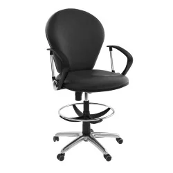 Assise et dossier en mousse injectée. Revêtement en simili cuir. Accoudoirs en acier chromé et Polypropylène noir. Mécanisme Basculant, tournant, roulant, réglable en hauteur. Structure étoilé à 05 branches en couleur chromé avec 05 roulettes tournantes roulantes à double galets même matière avec repose pieds métal chromé.