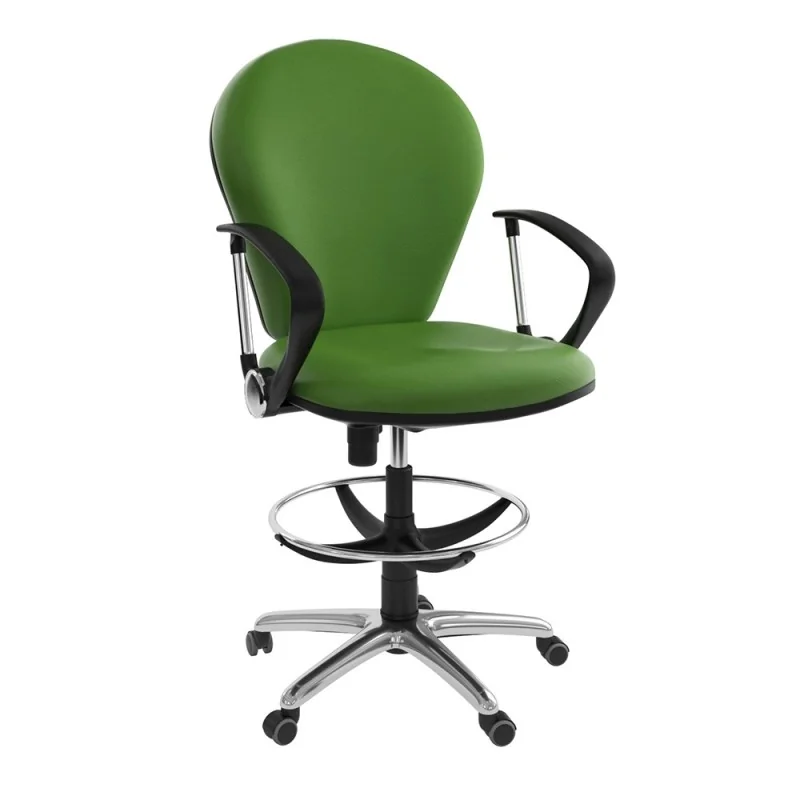 Assise et dossier en mousse injectée. Revêtement en simili cuir. Accoudoirs en acier chromé et Polypropylène noir. Mécanisme Basculant, tournant, roulant, réglable en hauteur. Structure étoilé à 05 branches en couleur chromé avec 05 roulettes tournantes roulantes à double galets même matière avec repose pieds métal chromé.