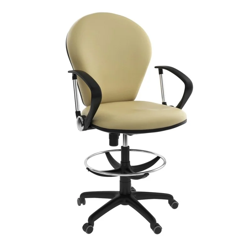 Assise et dossier en mousse injectée. Revêtement en simili cuir. Accoudoirs en acier chromé et Polypropylène noir. Mécanisme Basculant, tournant, roulant, réglable en hauteur. Structure étoilé à 05 branches en couleur noir avec 05 roulettes tournantes roulantes à double galets même matière avec repose pieds métal chromé.