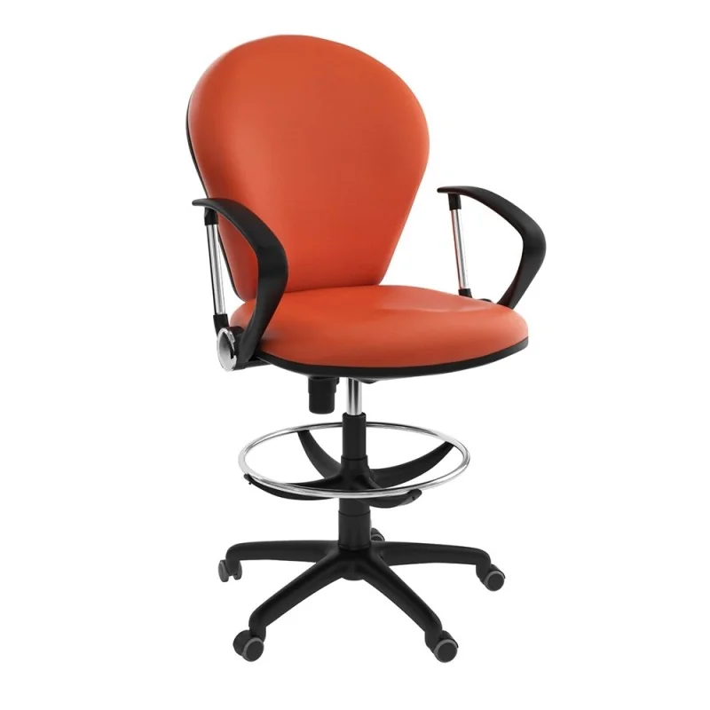 Assise et dossier en mousse injectée. Revêtement en simili cuir. Accoudoirs en acier chromé et Polypropylène noir. Mécanisme Basculant, tournant, roulant, réglable en hauteur. Structure étoilé à 05 branches en couleur noir avec 05 roulettes tournantes roulantes à double galets même matière avec repose pieds métal chromé.