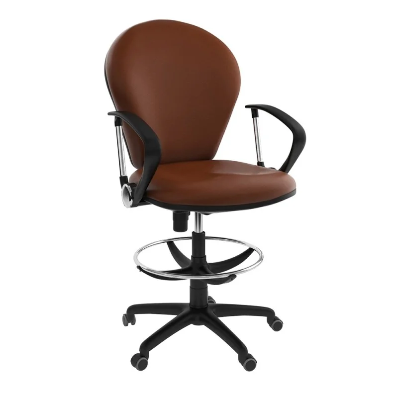 Assise et dossier en mousse injectée. Revêtement en simili cuir. Accoudoirs en acier chromé et Polypropylène noir. Mécanisme Basculant, tournant, roulant, réglable en hauteur. Structure étoilé à 05 branches en couleur noir avec 05 roulettes tournantes roulantes à double galets même matière avec repose pieds métal chromé.