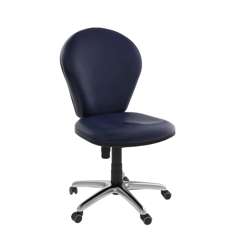 Assise et dossier en mousse injectée. Revêtement en simili cuir. Mécanisme Basculant, tournant, roulant, réglable en hauteur et en inclinaison. Structure étoilée à 05 branches en métallique chromé avec 05 roulettes tournantes roulantes à double galets même matière.