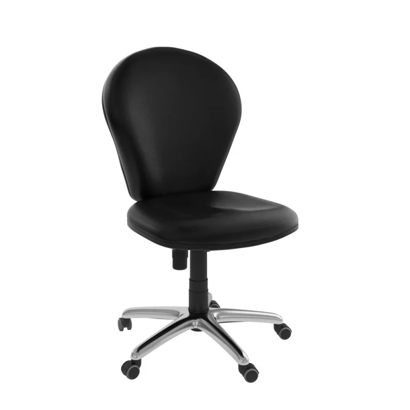 Assise et dossier en mousse injectée. Revêtement en simili cuir. Mécanisme Basculant, tournant, roulant, réglable en hauteur et en inclinaison. Structure étoilée à 05 branches en métallique chromé avec 05 roulettes tournantes roulantes à double galets même matière.