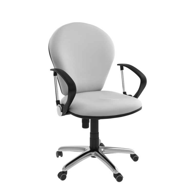 Assise et dossier en mousse injectée. Revêtement en simili cuir. Accoudoirs en acier chromé et Polypropylène noir. Mécanisme Basculant, tournant, roulant, réglable en hauteur et en inclinaison. Structure étoilée à 05 branches en métallique chromé avec 05 roulettes tournantes roulantes à double galets même matière.