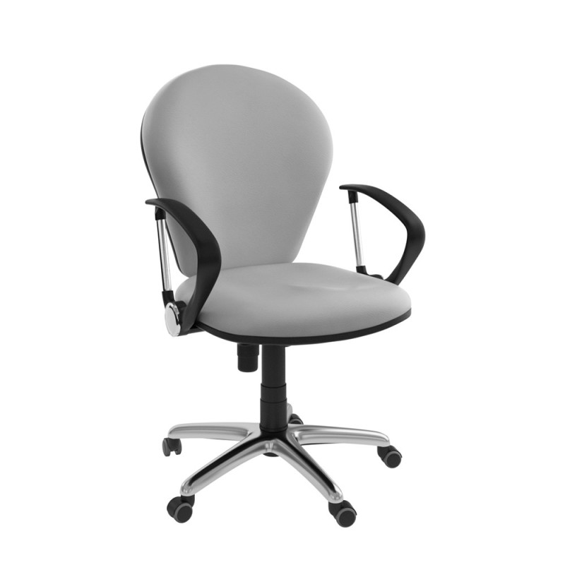 Assise et dossier en mousse injectée. Revêtement en simili cuir. Accoudoirs en acier chromé et Polypropylène noir. Mécanisme Basculant, tournant, roulant, réglable en hauteur et en inclinaison. Structure étoilée à 05 branches en métallique chromé avec 05 roulettes tournantes roulantes à double galets même matière.