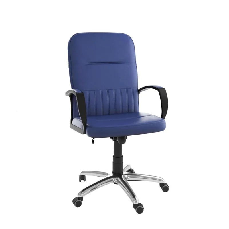 Assise et dossier rembourrés en mousse souple avec couche de dacron. Revêtement simili cuir. Accoudoirs fixe en Polypropylène couleur noir avec une partie tapissé. Mécanisme tournant, roulant, réglable en hauteur et en inclinaison. Structure étoilée à 05 branches en méttalique couleur chromé avec 05 roulettes tournantes roulantes à double galets même matière.