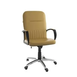 Assise et dossier rembourrés en mousse souple avec couche de dacron. Revêtement simili cuir. Accoudoirs fixe en Polypropylène couleur noir avec une partie tapissé. Mécanisme tournant, roulant, réglable en hauteur et en inclinaison. Structure étoilée à 05 branches en méttalique couleur chromé avec 05 roulettes tournantes roulantes à double galets même matière.
