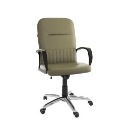 Assise et dossier rembourrés en mousse souple avec couche de dacron. Revêtement simili cuir. Accoudoirs fixe en Polypropylène couleur noir avec une partie tapissé. Mécanisme tournant, roulant, réglable en hauteur et en inclinaison. Structure étoilée à 05 branches en méttalique couleur chromé avec 05 roulettes tournantes roulantes à double galets même matière.
