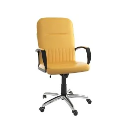 Assise et dossier rembourrés en mousse souple avec couche de dacron. Revêtement simili cuir. Accoudoirs fixe en Polypropylène couleur noir avec une partie tapissé. Mécanisme tournant, roulant, réglable en hauteur et en inclinaison. Structure étoilée à 05 branches en méttalique couleur chromé avec 05 roulettes tournantes roulantes à double galets même matière.