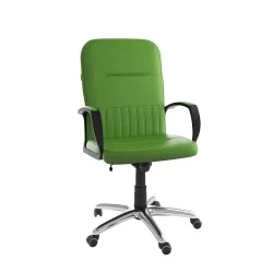Assise et dossier rembourrés en mousse souple avec couche de dacron. Revêtement simili cuir. Accoudoirs fixe en Polypropylène couleur noir avec une partie tapissé. Mécanisme tournant, roulant, réglable en hauteur et en inclinaison. Structure étoilée à 05 branches en méttalique couleur chromé avec 05 roulettes tournantes roulantes à double galets même matière.