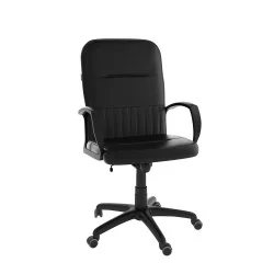 Assise et dossier rembourrés en mousse souple avec couche de dacron. Revêtement simili cuir. Accoudoirs fixe en Polypropylène couleur noir avec une partie tapissé. Mécanisme tournant, roulant, réglable en hauteur et en inclinaison. Structure étoilée à 05 branches en Polypropylène couleur noir avec 05 roulettes tournantes roulantes à double galets même matière.