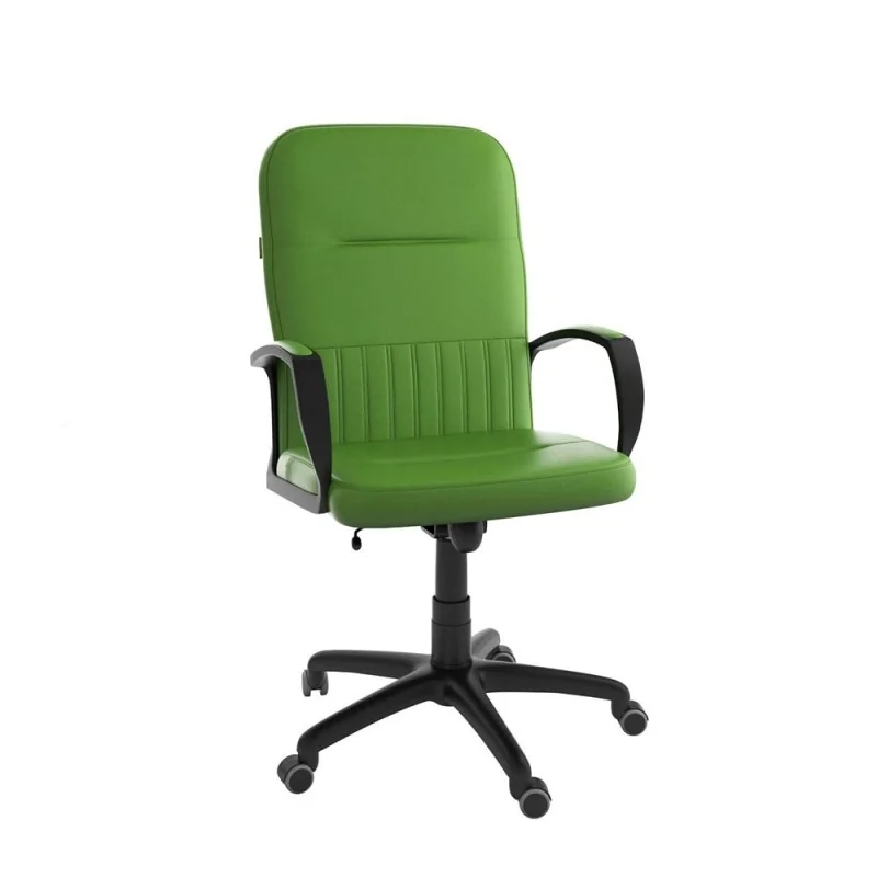 Assise et dossier rembourrés en mousse souple avec couche de dacron. Revêtement simili cuir. Accoudoirs fixe en Polypropylène couleur noir avec une partie tapissé. Mécanisme tournant, roulant, réglable en hauteur et en inclinaison. Structure étoilée à 05 branches en Polypropylène couleur noir avec 05 roulettes tournantes roulantes à double galets même matière.