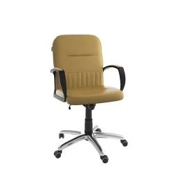 Assise et dossier rembourrés en mousse souple avec couche de dacron. Revêtement simili cuir. Accoudoirs fixe en Polypropylène couleur noir avec une partie tapissé. Mécanisme tournant, roulant, réglable en hauteur et en inclinaison. Structure étoilée à 05 branches en méttalique couleur chromé avec 05 roulettes tournantes roulantes à double galets même matière.