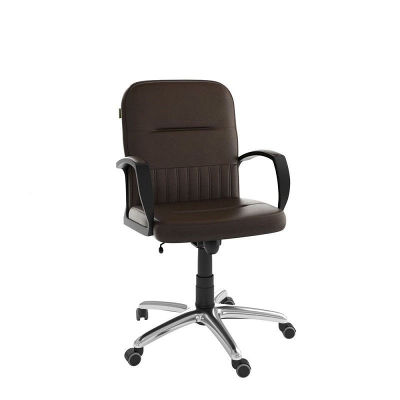 Assise et dossier rembourrés en mousse souple avec couche de dacron. Revêtement simili cuir. Accoudoirs fixe en Polypropylène couleur noir avec une partie tapissé. Mécanisme tournant, roulant, réglable en hauteur et en inclinaison. Structure étoilée à 05 branches en méttalique couleur chromé avec 05 roulettes tournantes roulantes à double galets même matière.