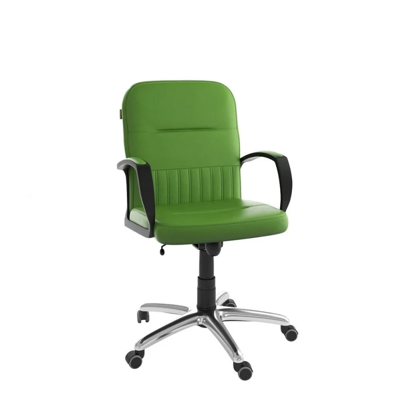 Assise et dossier rembourrés en mousse souple avec couche de dacron. Revêtement simili cuir. Accoudoirs fixe en Polypropylène couleur noir avec une partie tapissé. Mécanisme tournant, roulant, réglable en hauteur et en inclinaison. Structure étoilée à 05 branches en méttalique couleur chromé avec 05 roulettes tournantes roulantes à double galets même matière.