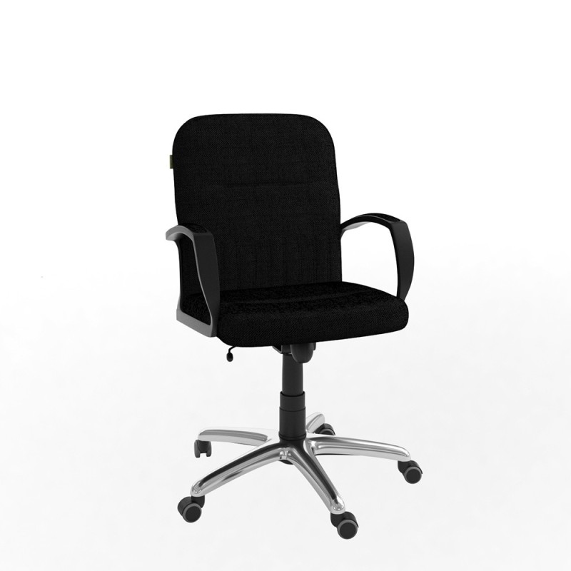 Assise et dossier rembourrés en mousse souple avec couche de dacron. Revêtement simili cuir. Accoudoirs fixe en Polypropylène couleur noir avec une partie tapissé. Mécanisme tournant, roulant, réglable en hauteur et en inclinaison. Structure étoilée à 05 branches en méttalique couleur chromé avec 05 roulettes tournantes roulantes à double galets même matière.
