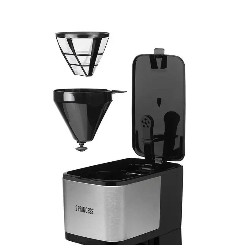 La cafetière filtre Compact 8 Princess permet de préparer jusqu’à 8 tasses de café grâce à sa verseuse en verre de 0,75 L. Elle est dotée de plusieurs fonctions pratiques : maintien au chaud pendant 40 minutes, arrêt automatique, filtre permanent réutilisable, et système anti-goutte. Avec sa puissance de 600 W et son format compact, elle est aussi adaptée au camping. Facile à nettoyer, elle dispose de pièces compatibles lave-vaisselle et d’un design élégant en plastique avec finitions inox.