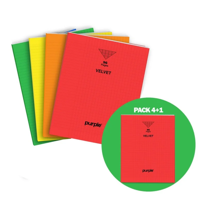 PACK Cahier 4+1 Couverture PP A4 Velvet, 96 pages, 17x22 cm. Ce cahier allie fonctionnalité et élégance grâce à sa couverture en polypropylène (PP). Il comprend 96 pages de papier de haute qualité, idéales pour prendre des notes ou faire des croquis. Avec son format A4, il offre un espace généreux, tandis que sa couverture résistante protège vos écrits.