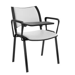 Assise et dossier rembourrés en mousse souple revêtu en simili cuir ou tissu. Accoudoirs fixe en métal recouvert de couleur noir avec écritoire en polyvinyle noir anti paniqué. Piétements structure métallique époxy noir à 4 piètements avec patins de protections antidérapantes sur les extrémités.