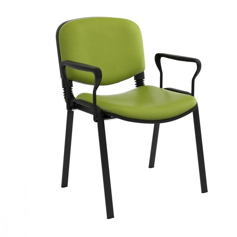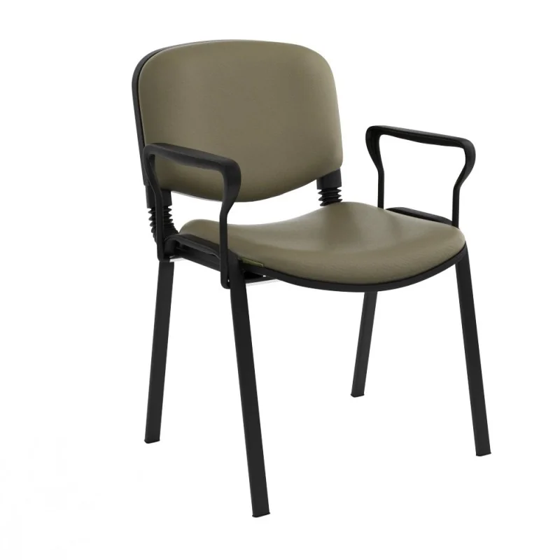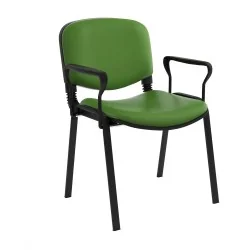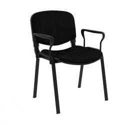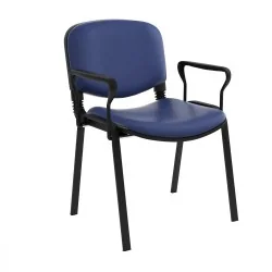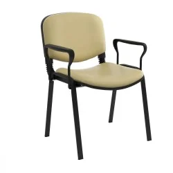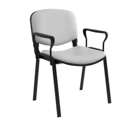 Assise et dossier rembourrés en mousse souple revêtu en simili cuir. Accoudoirs fixe en métal recouvert de polypropylène couleur noir. Structure métallique époxy noir à 4 piètements avec patins de protections antidérapants sur les extrémités.