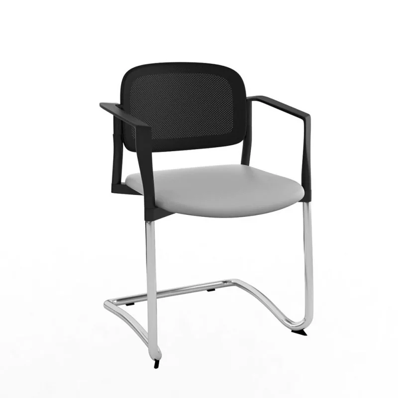 Assise rembourré en mousse souple revêtu en simili cuir, dossier en tissu mesh. Accoudoirs en polypropylène. Structure métallique chromé avec patins de protections antidérapants.