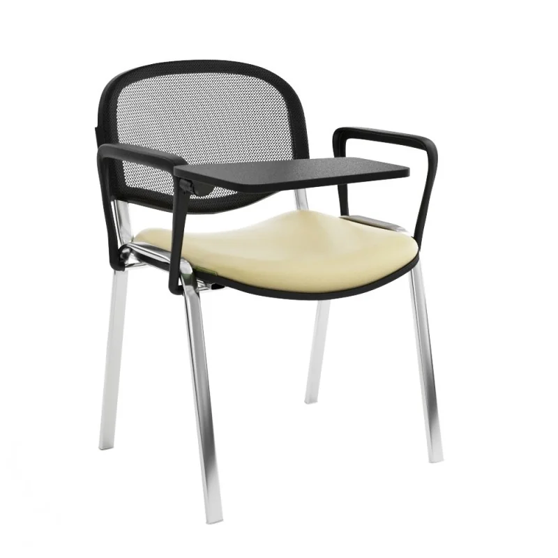Dossier en tissu mesh. Assise rembourrés en mousse souple revêtu en simili cuir ou tissu. Accoudoirs fixe en métal recouvert de couleur noir avec écritoire en polyvinyle noir anti paniqué. Piétements structure chromé à 4 piètements avec patins de protections antidérapantes sur les extrémités.
