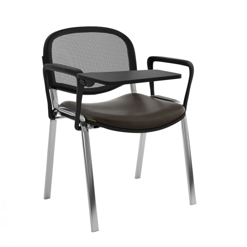 Dossier en tissu mesh. Assise rembourrés en mousse souple revêtu en simili cuir ou tissu. Accoudoirs fixe en métal recouvert de couleur noir avec écritoire en polyvinyle noir anti paniqué. Piétements structure chromé à 4 piètements avec patins de protections antidérapantes sur les extrémités.