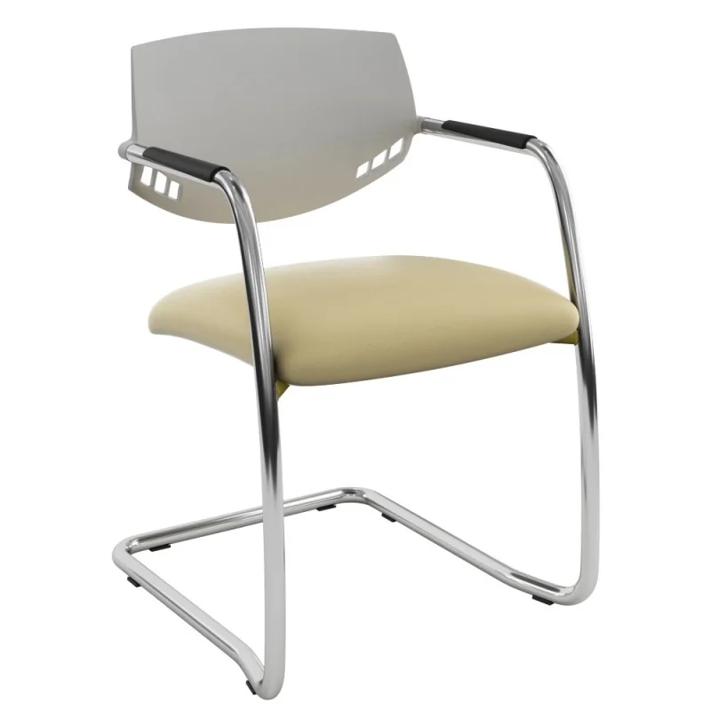 Assise rembourré en mousse souple revêtu en simili cuir, dossier en polypropylène. Accoudoirs fixe en métal chromé. Structure métallique chromé avec patins de protections antidérapant sur les extrémités.