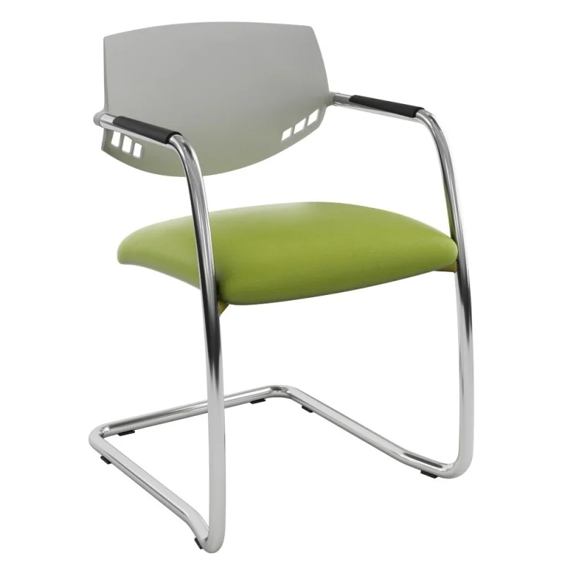 Assise rembourré en mousse souple revêtu en simili cuir, dossier en polypropylène. Accoudoirs fixe en métal chromé. Structure métallique chromé avec patins de protections antidérapant sur les extrémités.