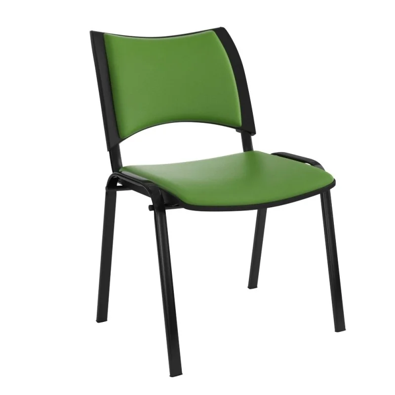 Assise et dossier rembourrés en mousse souple revêtu en simili cuir. Accoudoirs fixe en métal recouvert de polypropylène couleur noir. Structure métallique époxy noir à 4 piètements avec patins de protections antidérapants sur les extrémités.