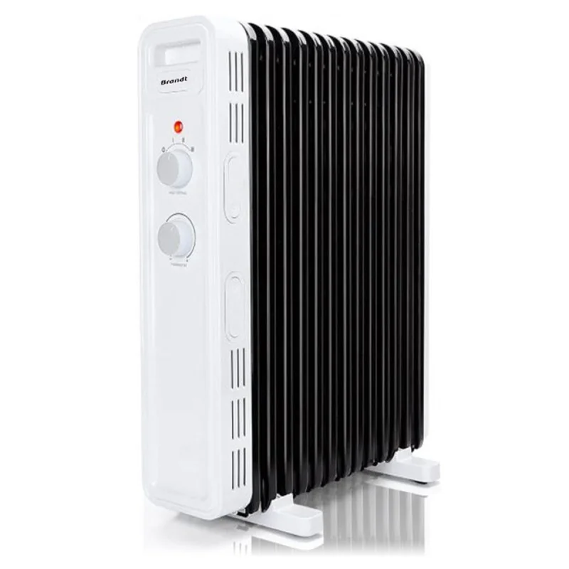 Radiateur à Bain d'Huile Brandt RBH11BBW - puissance 2500 W - 13 éléments radiants pour une diffusion efficace de la chaleur - 3 niveaux de chaleur (1000W/1500W/2500W) et thermostat réglable - Alimentation 220-240V - Système anti-surchauffe, roulettes et rangement du cordon - Dimensions : 390x226x570 mm - Garantie 1 an