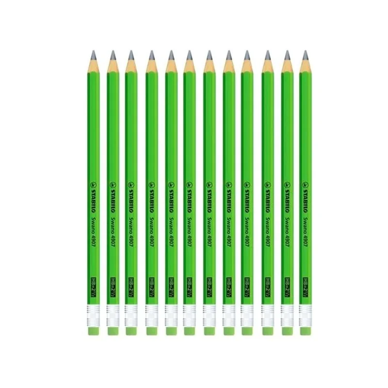 Crayons noir STABILO Swano Neon, dotés d’une gomme verte. Idéaux pour des dessins précis et une finition nette, ces crayons allient performance et style.