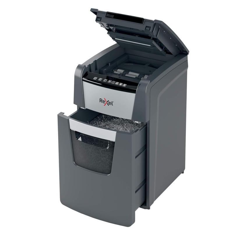 Contenu : 1 destructeur Rexel Auto+ 130X coupe croisée, capacité de 130 feuilles, corbeille de 44 litres. Dimensions : 365 (l) x 618 (h) x 430 (p).
