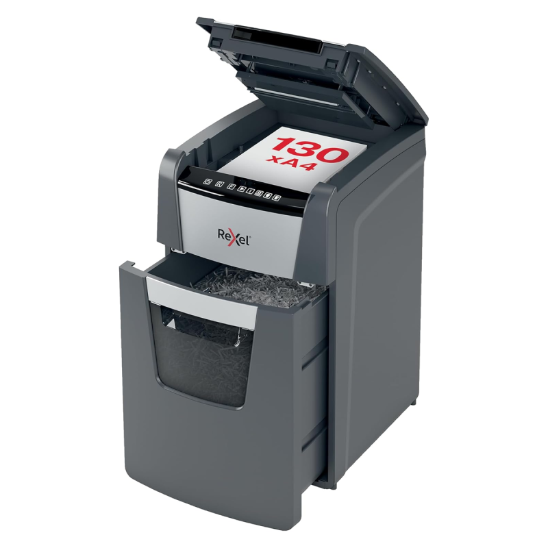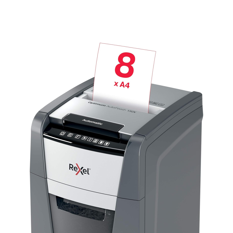 Destructeur Rexel Optimum Auto+ 130X détruit automatiquement jusqu'à 130 feuilles A4 (80g/m²) et jusqu’à 8 feuilles manuellement. Il dispose d’une corbeille amovible de 44 litres, facile à vider, et assure une destruction sécurisée des documents au format A4.
